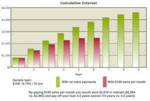 “In this image (click it to enlarge) you can see that paying $150 extra per month saves over $3K and more than 5 YEARS off the repayment term! Just $50 extra per month can save almost $2K and shave about 3 years off your repayment term. And $100 extra per month saves you almost $3K and cuts about 4 1/2 years off the term. So while paying what seems like a nominal amount extra each month on a 5 figure loan may seem like throwing a brick in the Grand Canyon, the impact is really quite remarkable!”